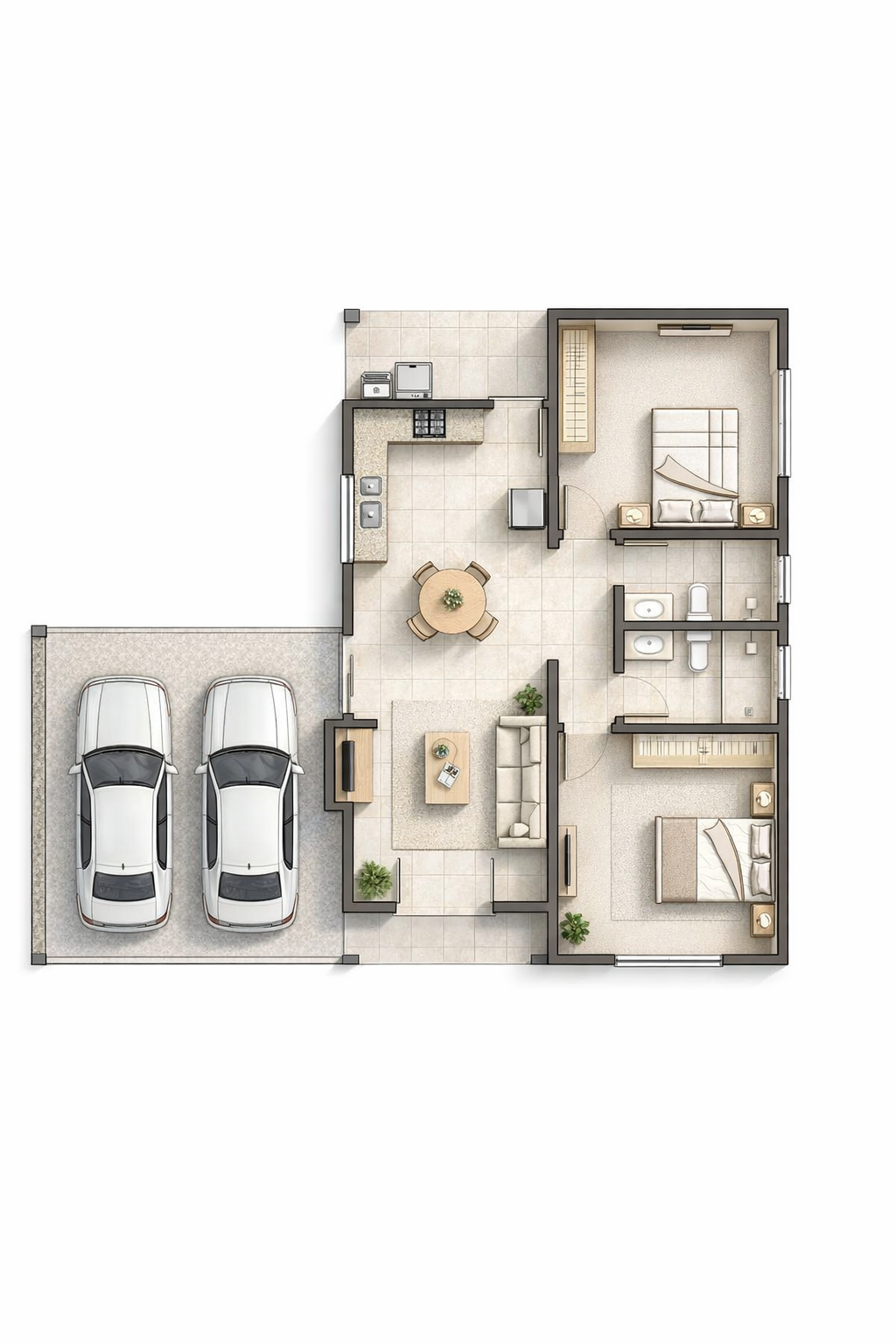 A área social conecta sala de estar e jantar à cozinha americana, criando um espaço fluido, ideal para o dia a dia e para receber. A varanda frontal complementa o projeto com charme e leveza, enquanto a garagem para dois carros garante funcionalidade e conforto.