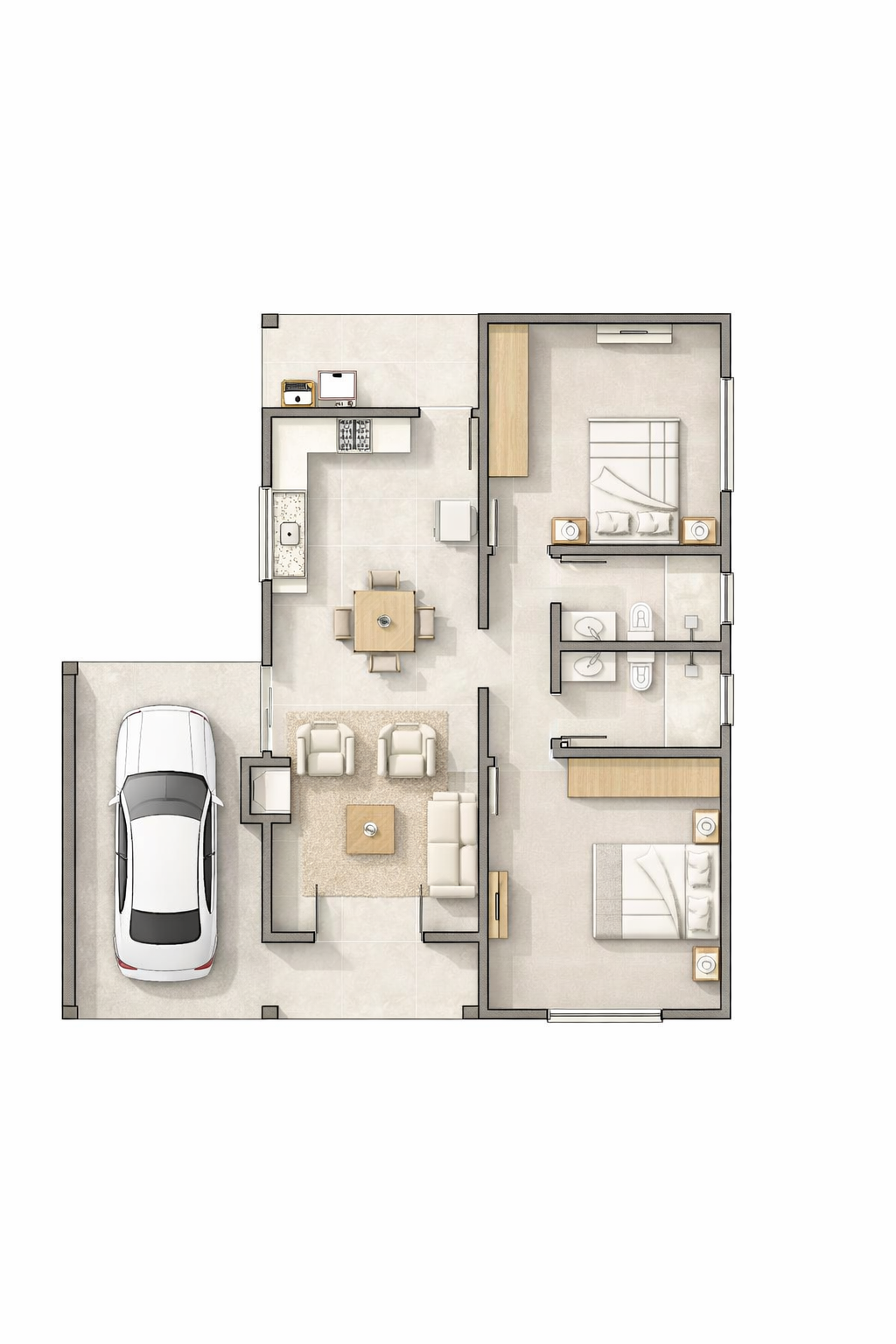Na área íntima, dois dormitórios bem distribuídos garantem conforto e privacidade, sendo uma suíte pensada como refúgio particular. O banheiro social atende com praticidade, enquanto a área de serviço separada reforça a organização do lar.