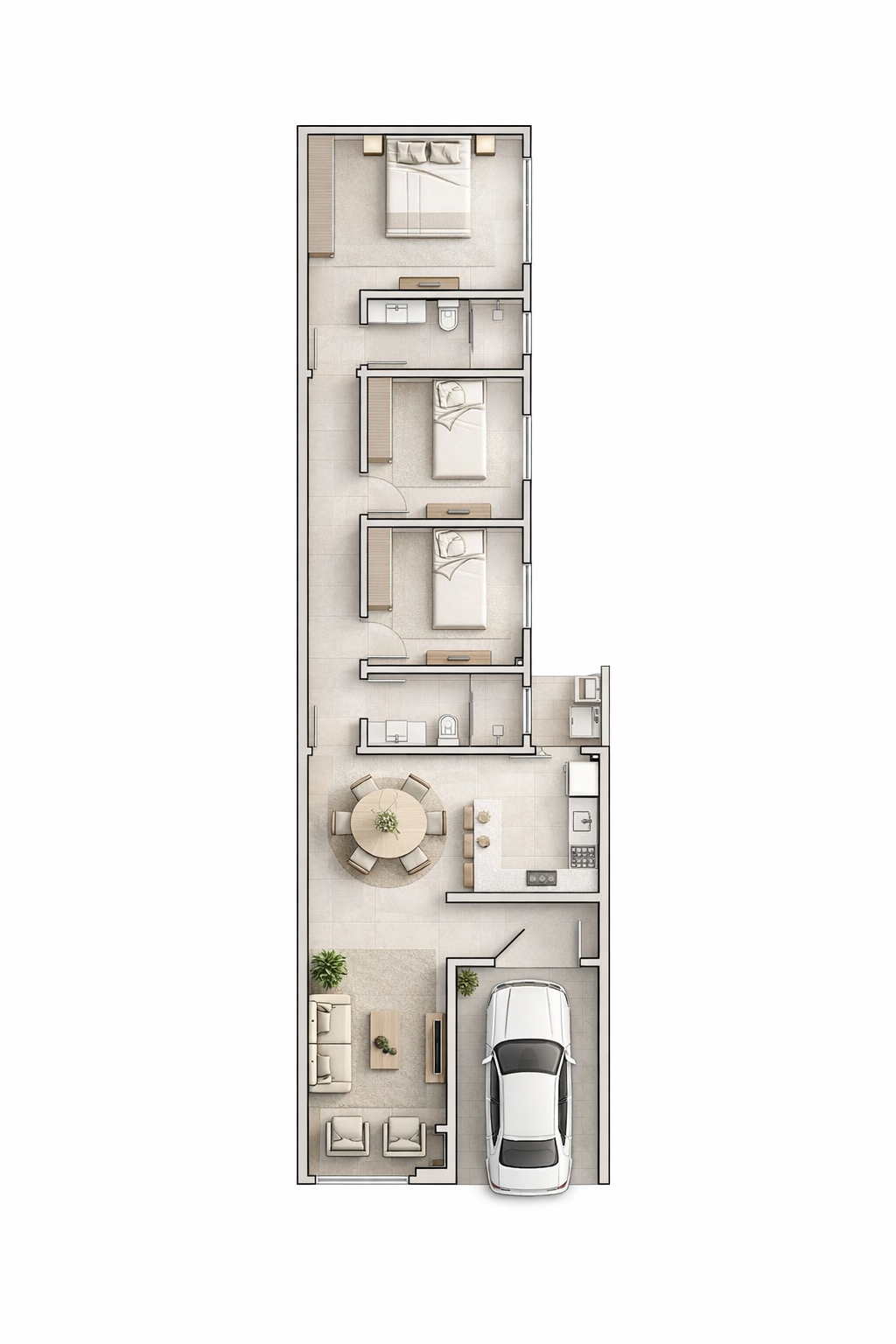 O layout foi cuidadosamente desenvolvido para proporcionar integração e fluidez entre os ambientes, contando com três dormitórios, sendo uma suíte com closet, além de banheiro social bem distribuído. A área social valoriza a convivência com sala de estar e jantar integradas à cozinha americana, criando um espaço moderno e acolhedor. A área de serviço é independente, garantindo organização e funcionalidade, enquanto a garagem para um carro completa o conjunto com praticidade.