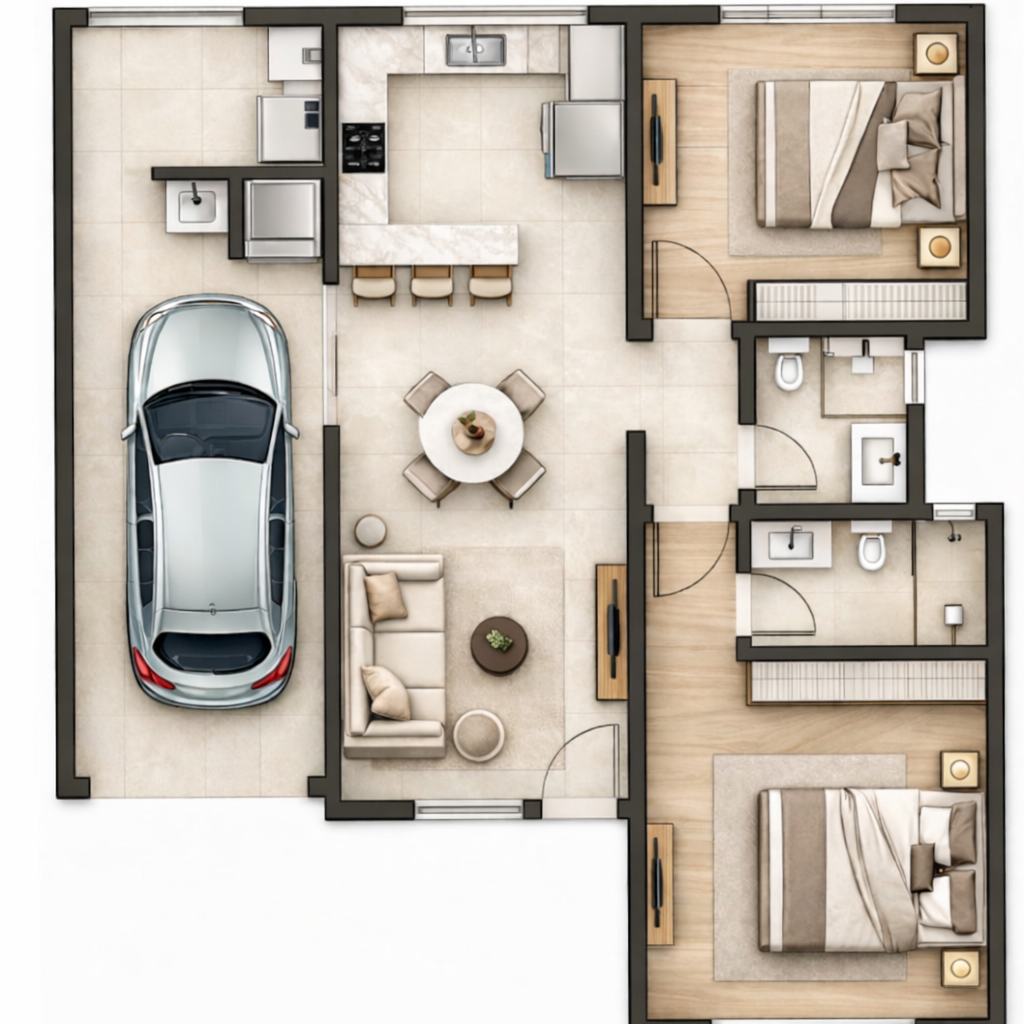 Um projeto pensado para quem busca conforto, funcionalidade e um visual encantador. A Casa Margarida une praticidade no dia a dia com um design acolhedor e bem resolvido. Com área construída de 101,42 m², foi desenvolvida para um terreno sugerido de 10,65 x 20 m, aproveitando de forma inteligente cada espaço.